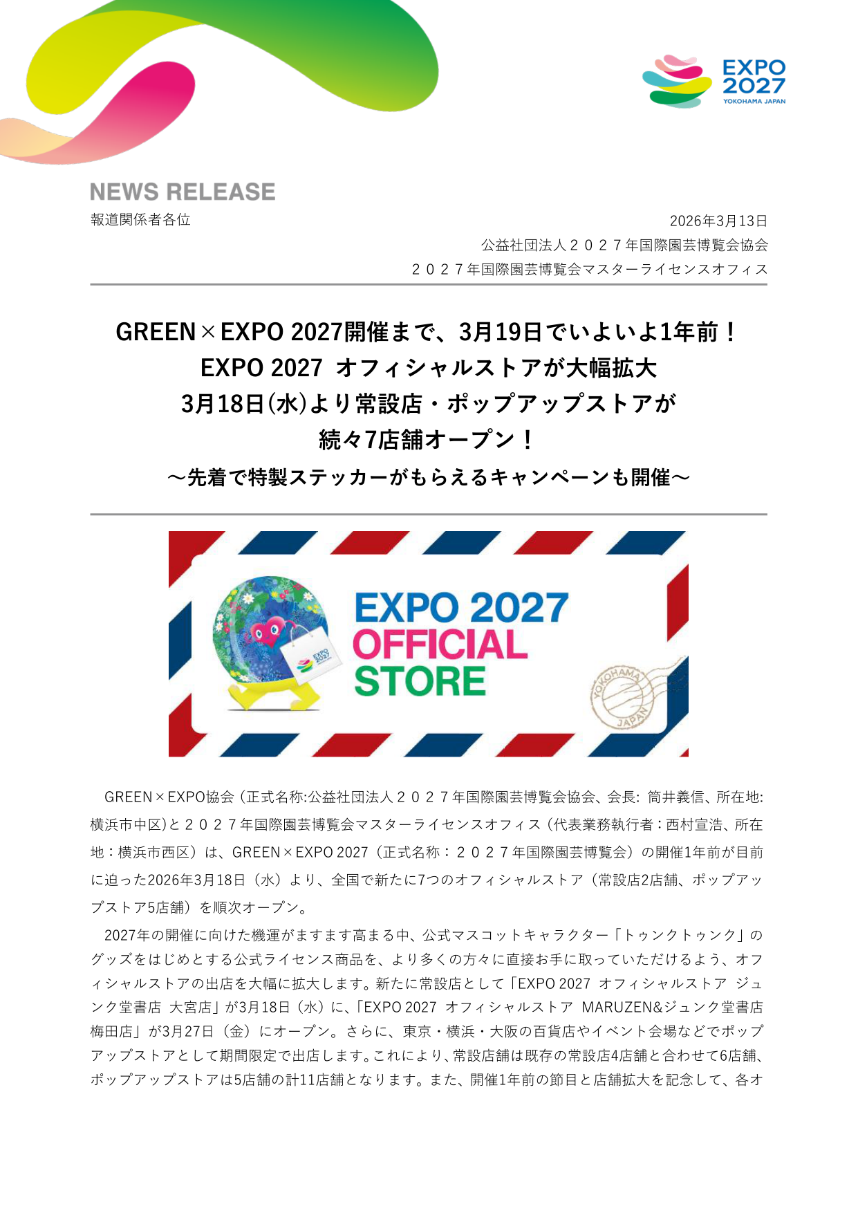 公益社団法人2027年国際園芸博覧会協会(GREEN×EXPO協会)と2027年国際園芸博覧会マスターライセンスオフィス(2027MLO)は、2027年国際園芸博覧会(GREEN×EXPO 2027)の開催1年前が目前に迫ったことを受け、2026年3月18日(水)より全国で新たに7つのオフィシャルストアを順次オープンすることを発表しました。