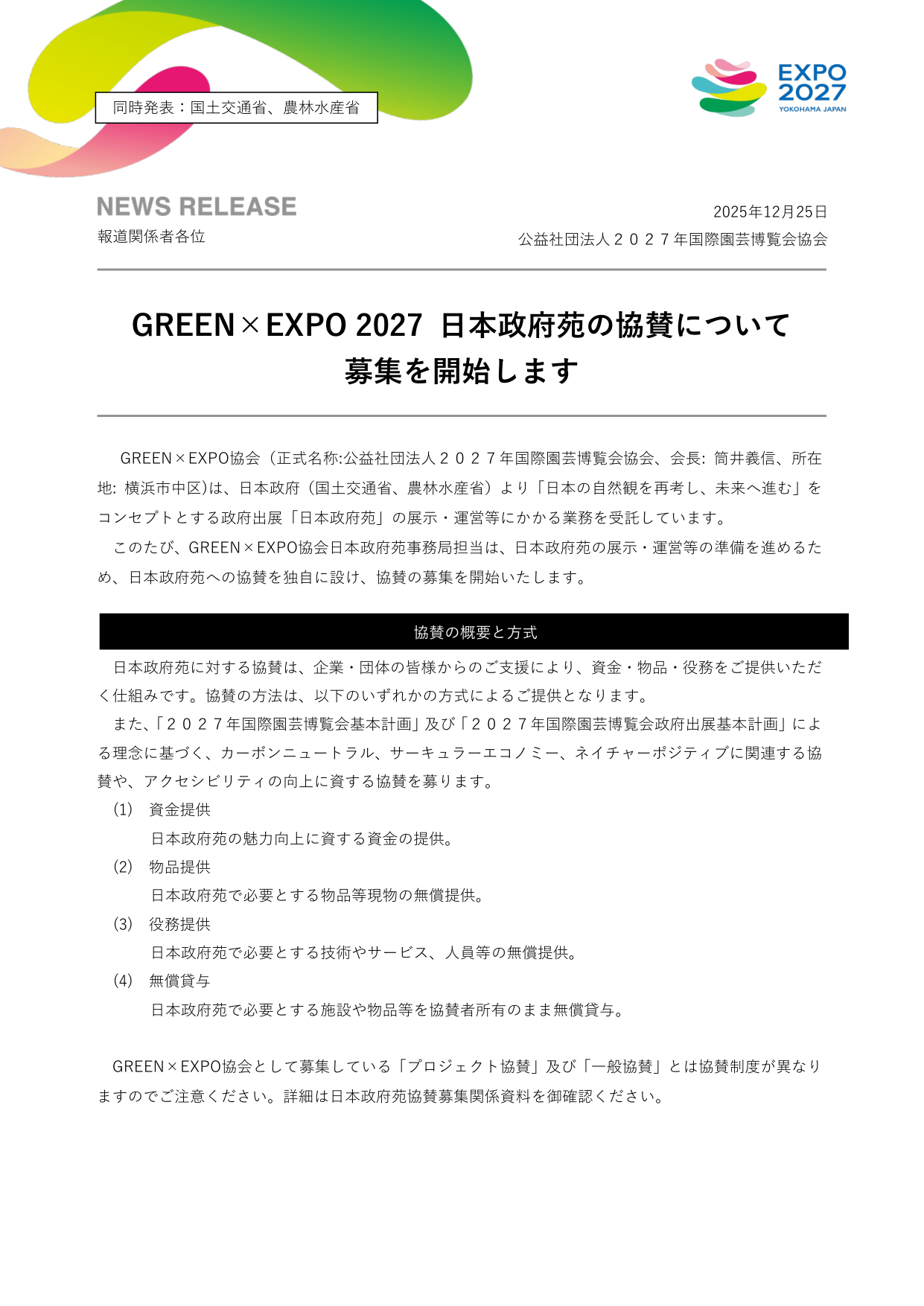 公益社団法人2027年国際園芸博覧会協会(GREEN×EXPO協会)は、2025年12月25日、「2027年国際園芸博覧会(GREEN×EXPO 2027)」における「日本政府苑」への協賛募集を開始したことを発表しました。