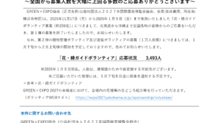 公益社団法人2027年国際園芸博覧会協会は、GREEN×EXPO 2027「花・緑ガイドボランティア」の募集結果を発表しました。 約200名の募集枠に対し、全国から3,493名もの応募があり、定員を大幅に上回る反響を呼びました。 今後、1万...