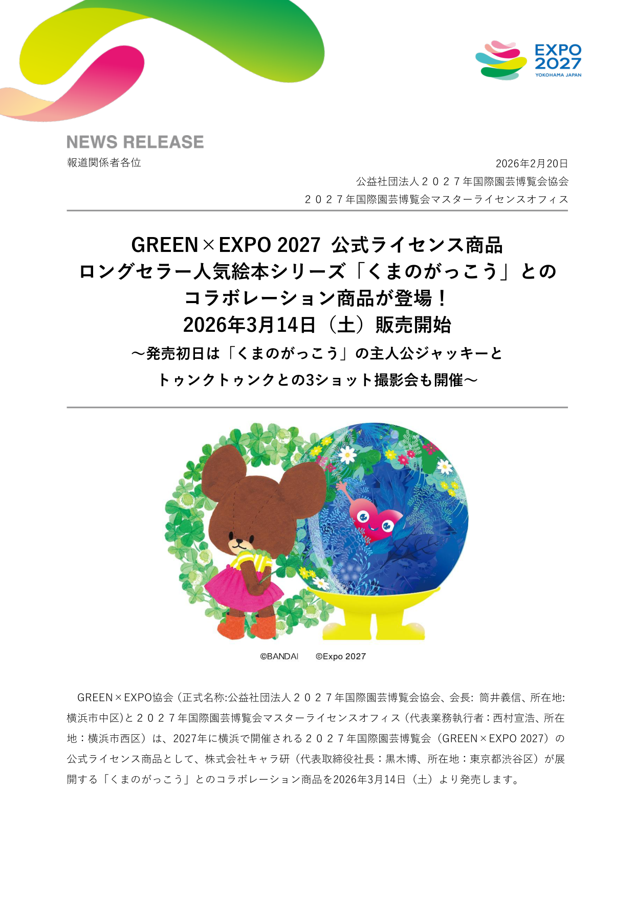 公益社団法人2027年国際園芸博覧会協会(GREEN×EXPO協会)と2027年国際園芸博覧会マスターライセンスオフィス(2027MLO)は、2027年に横浜で開催される「2027年国際園芸博覧会(GREEN×EXPO 2027)」の公式ライセンス商品として、株式会社キャラ研が展開する「くまのがっこう」とのコラボレーション商品を2026年3月14日(土)より発売することを発表しました。