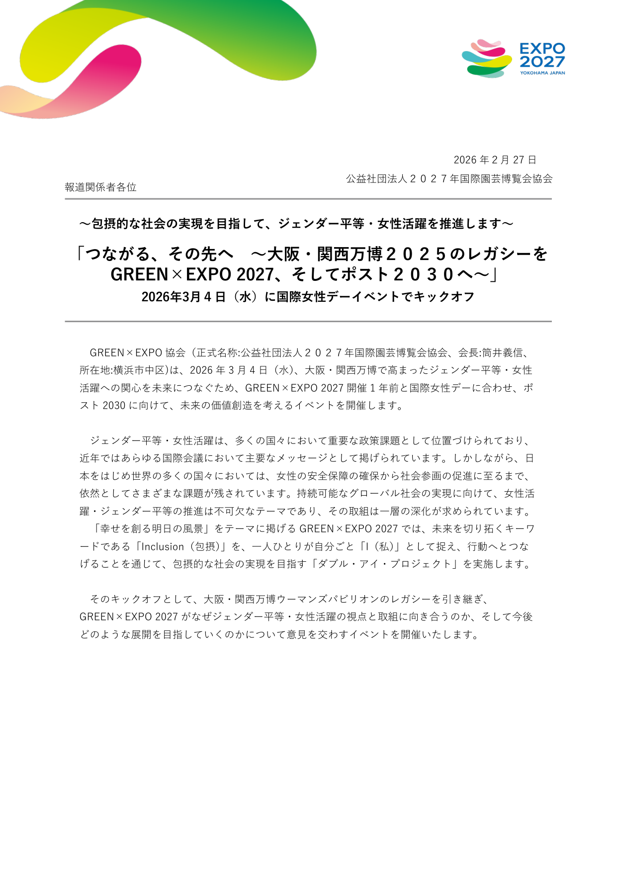 公益社団法人2027年国際園芸博覧会協会(GREEN×EXPO協会、会長:筒井義信、所在地:横浜市中区)は、2026年3月4日(水)に、国際女性デーイベント「つながる、その先へ ~大阪・関西万博2025のレガシーをGREEN×EXPO 2027、そしてポスト2030へ~」を開催すると発表しました。