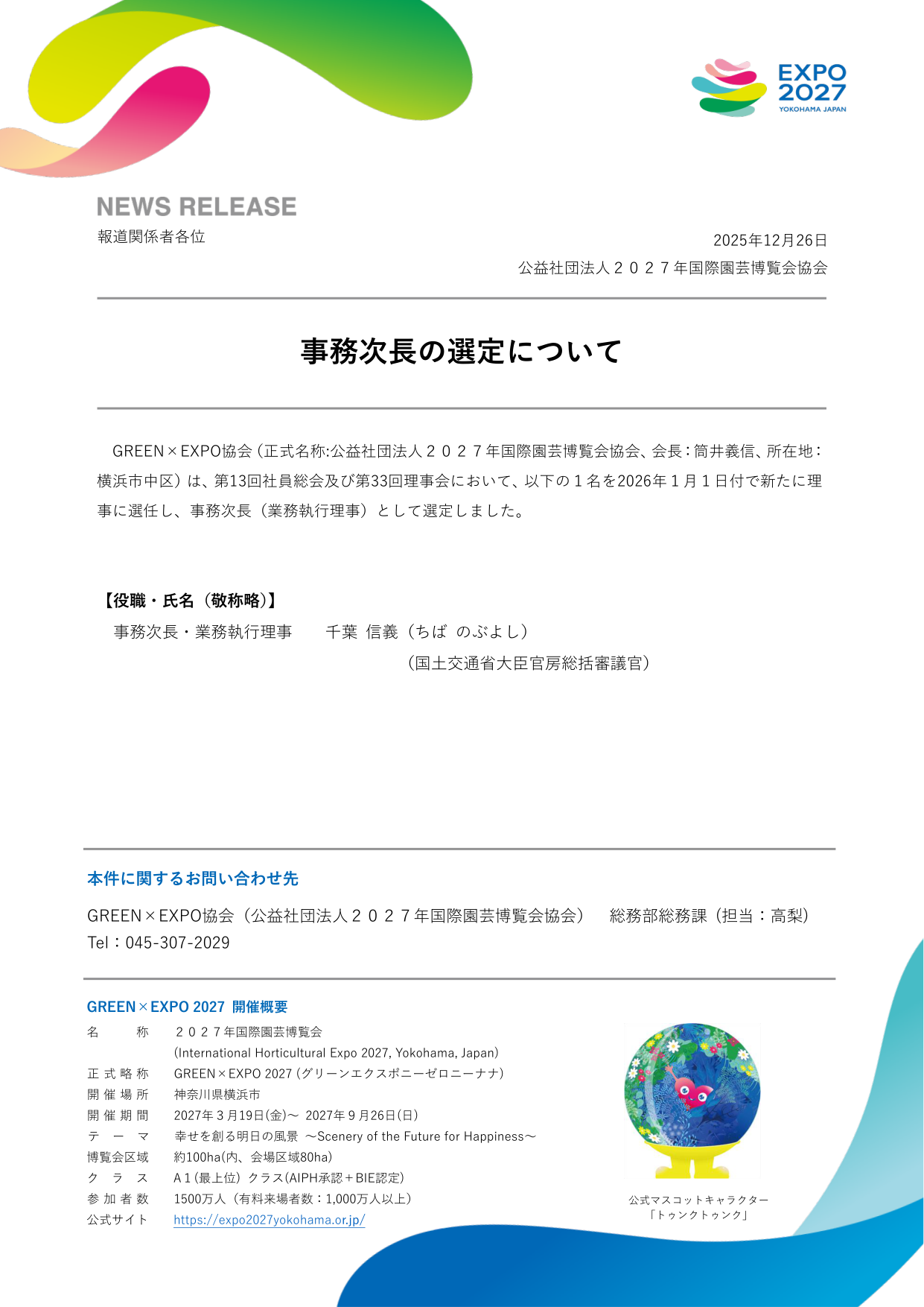 公益社団法人2027年国際園芸博覧会協会(通称:GREEN×EXPO協会、会長:筒井義信、所在地:横浜市中区)は、2025年12月26日付のプレスリリースにて、新たな事務次長(業務執行理事)を選任したことを発表しました。