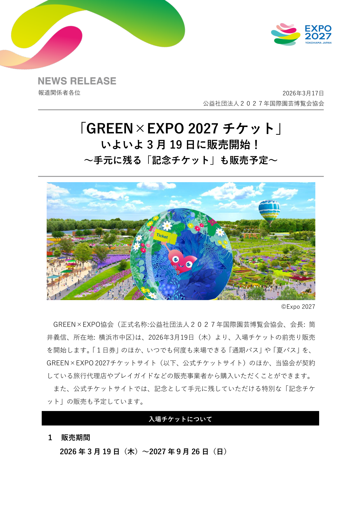 2027年国際園芸博覧会(GREEN×EXPO 2027)の入場チケットが、2026年3月19日(木)より前売り販売を開始します。