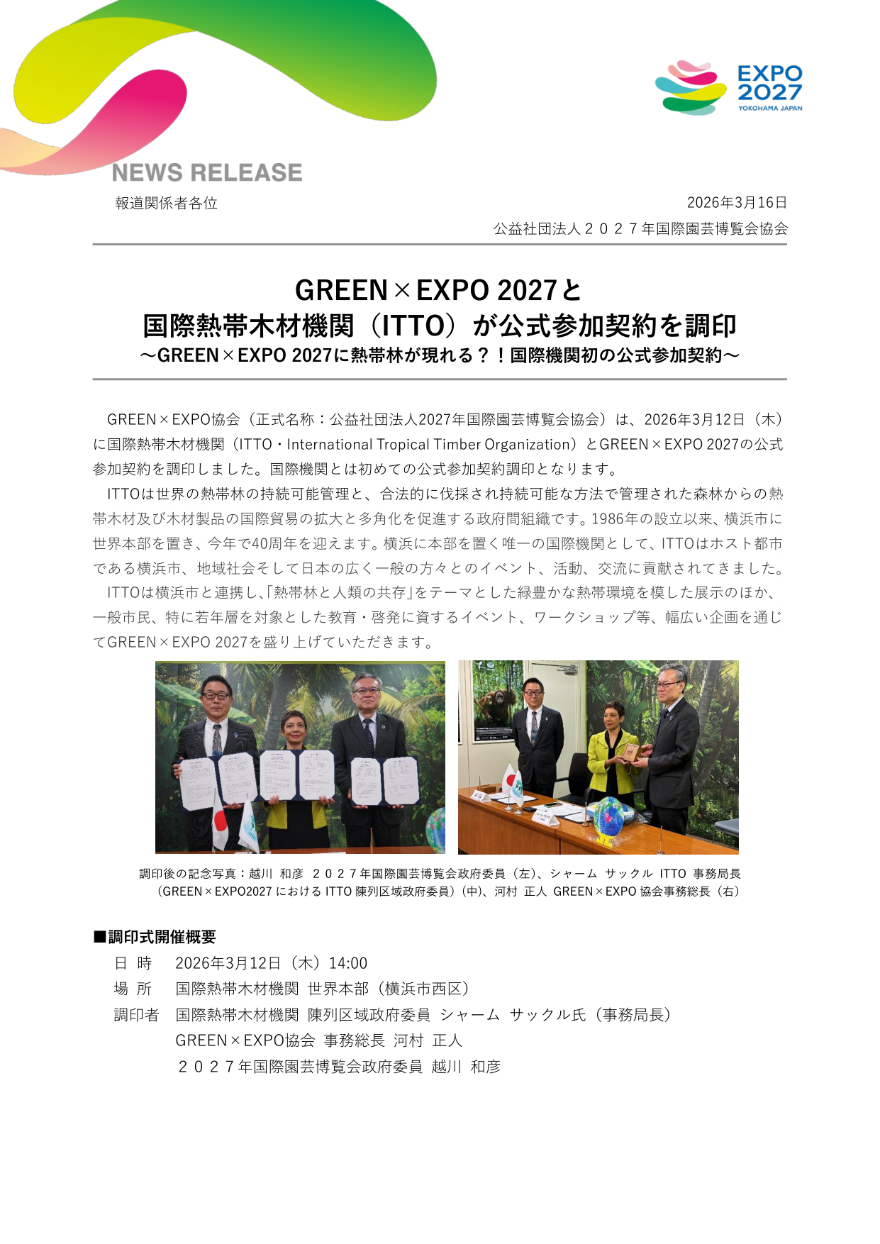 公益社団法人2027年国際園芸博覧会協会は、2026年3月12日に国際熱帯木材機関(ITTO)との公式参加契約を調印しました。