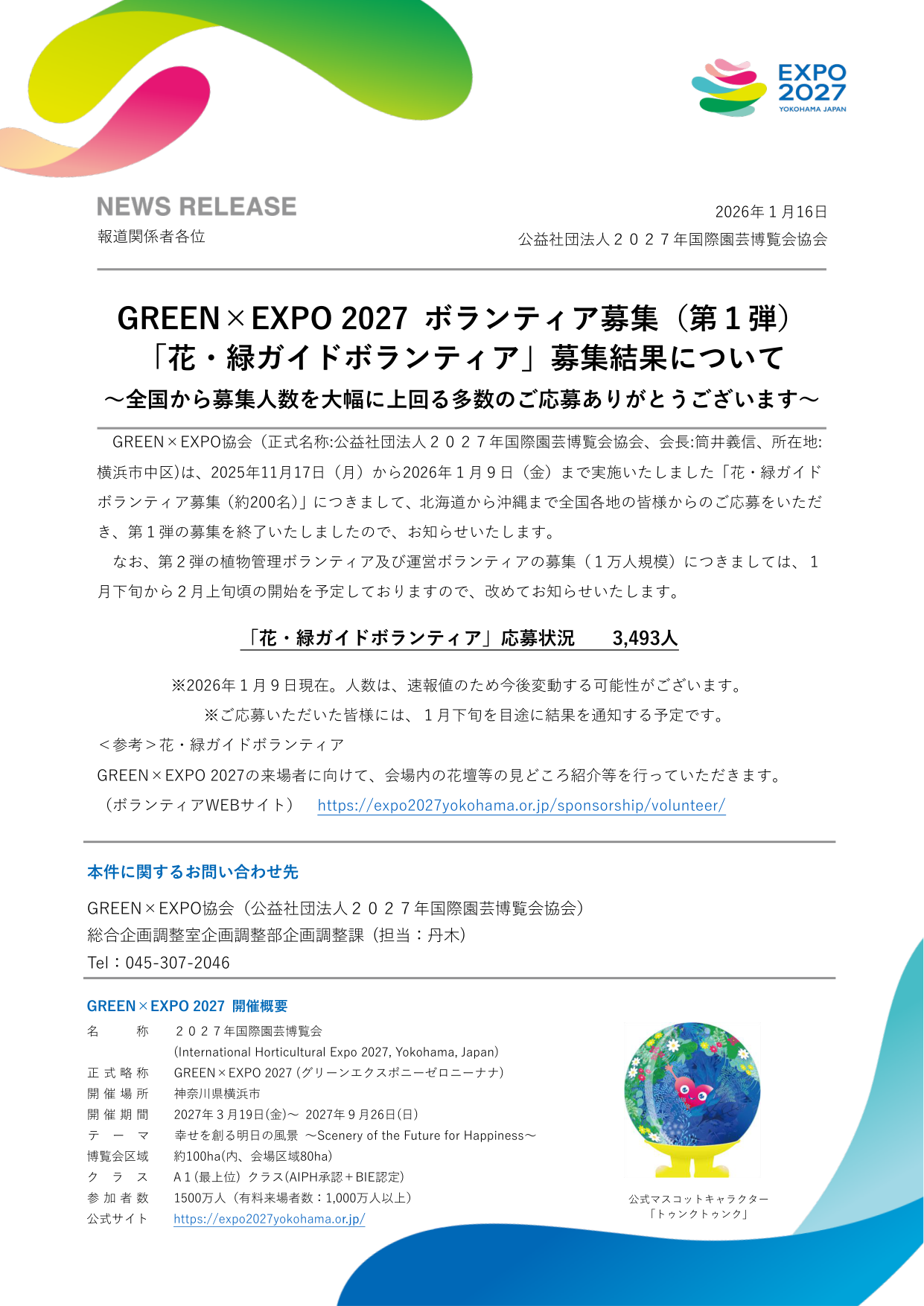 2026年1月16日、公益社団法人2027年国際園芸博覧会協会(GREEN×EXPO協会、会長:筒井義信、所在地:横浜市中区)は、「2027年国際園芸博覧会(GREEN×EXPO 2027)」の「花・緑ガイドボランティア」(第1弾)の募集結果について発表しました。