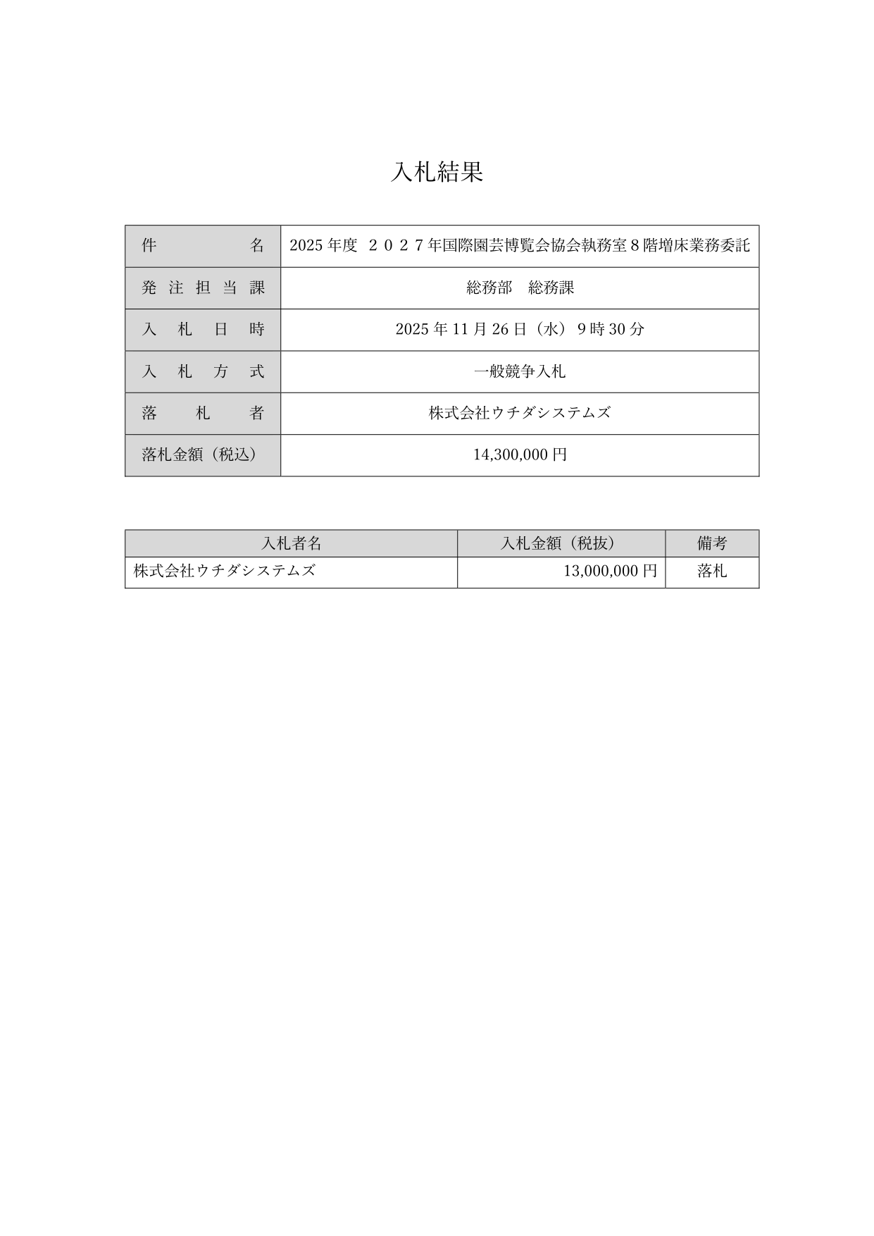 公益社団法人2027年国際園芸博覧会協会は、執務室8階増床業務委託の一般競争入札結果を2026年1月13日に公表しました。